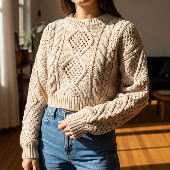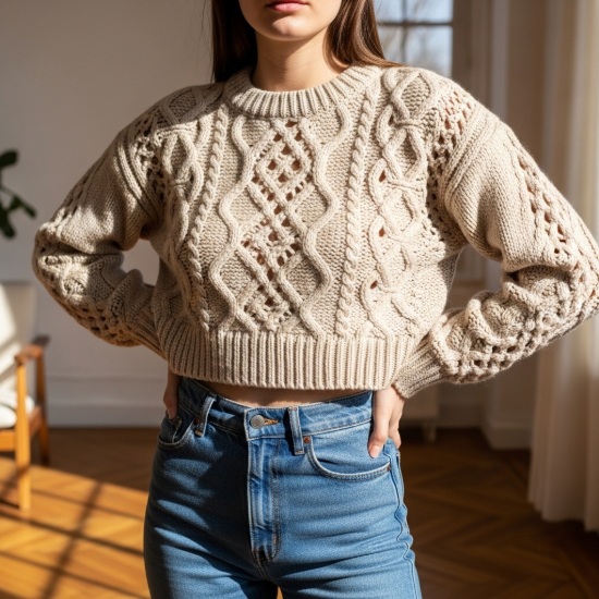 • Tasarım Detayları: Hafif kısa (crop) kesimi, yüksek bel alt gruplarıyla mükemmel bir oran yakalamanızı sağlar. Göğüs ve kol kısımlarında yoğunlaşan iri saç örgüsü detayları, kazağa zengin ve boyutlu bir görünüm verir. Yuvarlak (bisiklet) yaka tasarımı, kol ve etek uçlarındaki kalın ribana bitişlerle desteklenmiştir.